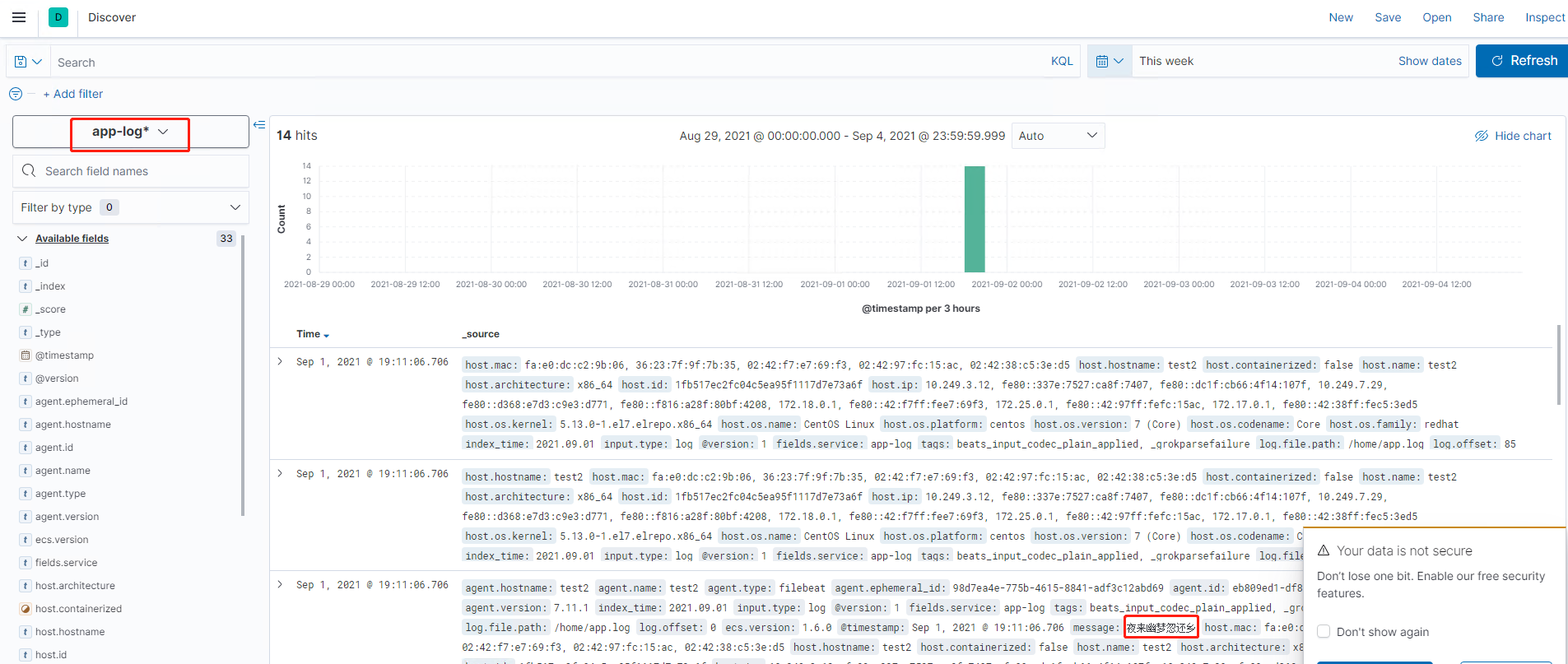到此所有的服务都已经启动了,我们来测试一下,在filebeat中配置的path目录下的文件中新增信息