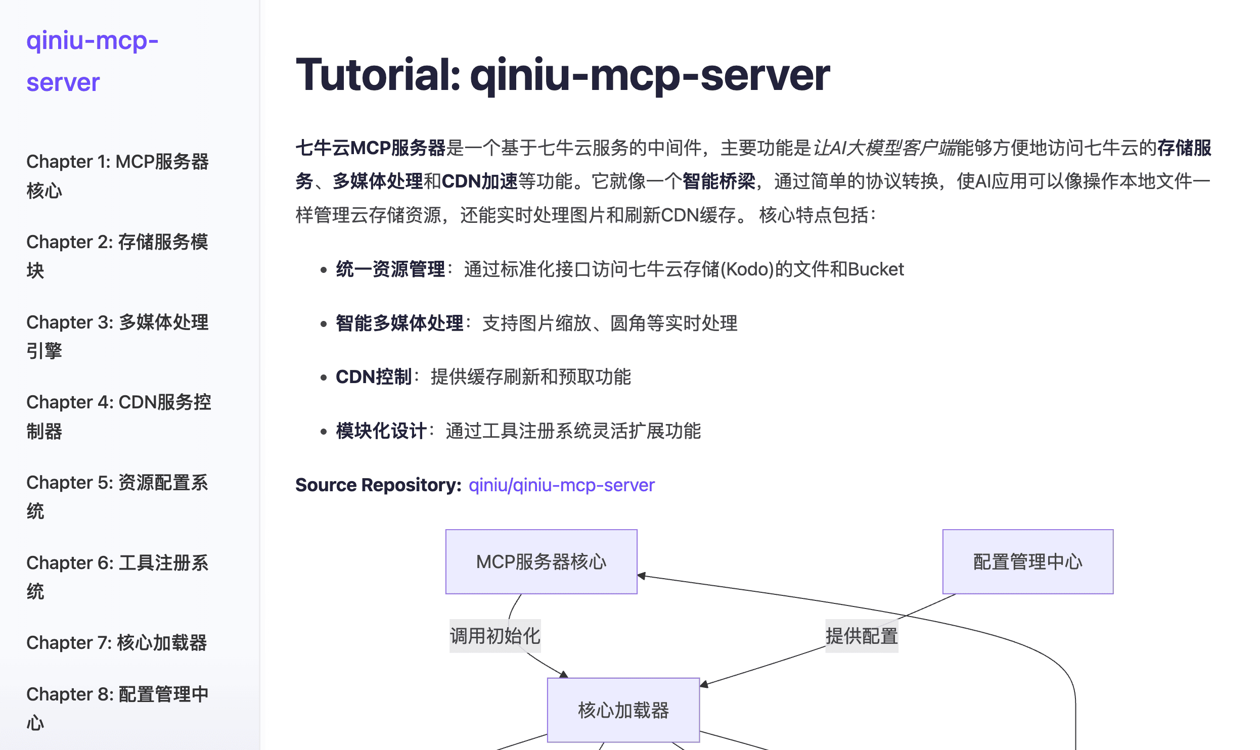 尝试:Codebase-Knowledge 是 AI 自动生成代码库教程,它生成的教程比文档短,比月刊描述多。所以我就动手改造了下,写了一个 markdown2html 和 push2qiniu 模块,以及接入 DeepSeek 的适配,直接实现一条命令生成图文并茂、精简的开源项目教程。