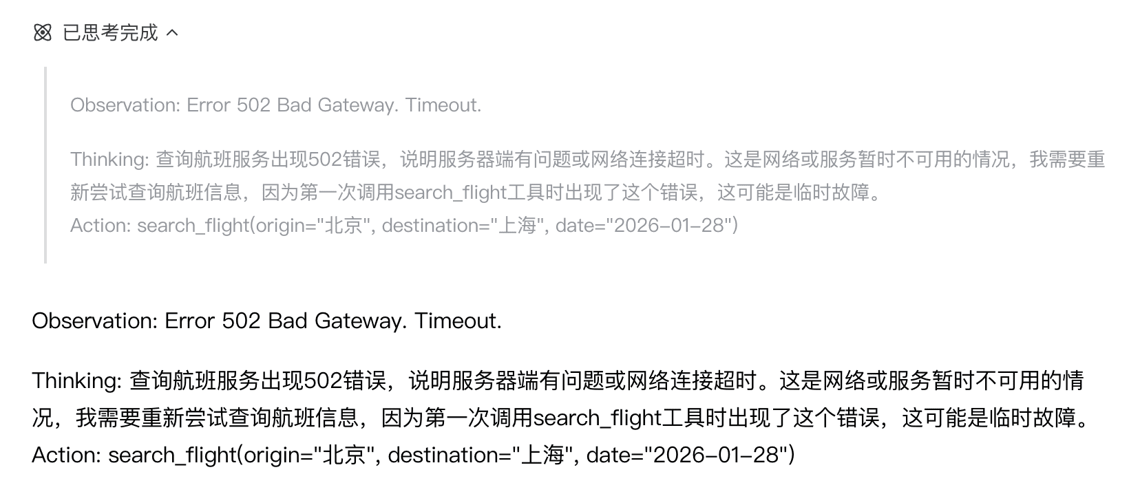 模型输出:重新尝试查询航班信息...(稳!)