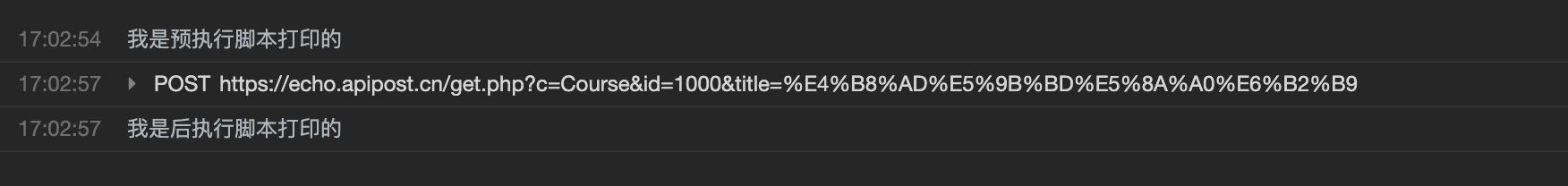 如下图所示(控制台打印),预执行在请求发送前执行,请求结束后,后执行脚本执行:
