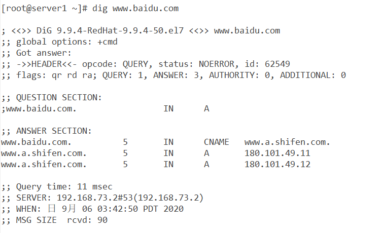 补充内容:dig命令同样可以测试DNS域名解析,并且比nslookup命令解析域名信息更加详细