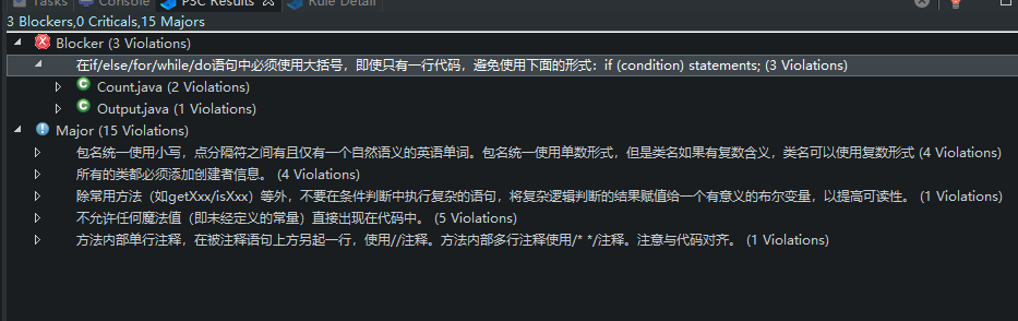 2 采用"阿里巴巴Java开发代码检测IDE插件"作为静态代码检查工具(下载地址:https://github.com/alibaba/p3c/tree/master/eclipse-plugin),扫描代码,主要错误截图如下(乱码是字符编码问题):