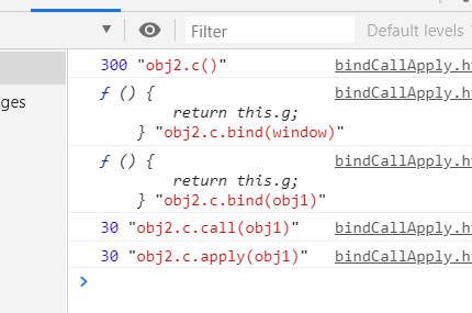 var g = 3; // 全局变量 window的属性 let obj1 = { g:30 } let obj2 = { id: Symbol("ids"), g:300, c:function() { return this.g; } } /*常态下调用obj2的c方法*/ console.log(obj2.c(),"obj2.c()"); //调用obj2的c方法在链式调用bind方法 console.log(obj2.c.bind(window),"obj2.c.bind(window)") console.log(obj2.c.bind(obj1),"obj2.c.bind(obj1)") //调用obj2的c方法在链式调用call方法 console.log(obj2.c.call(obj1),"obj2.c.call(obj1)") //调用obj2的c方法在链式调用apply方法 console.log(obj2.c.apply(obj1),"obj2.c.apply(obj1)")