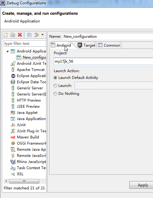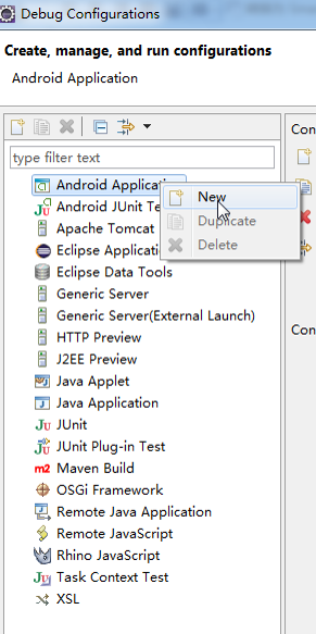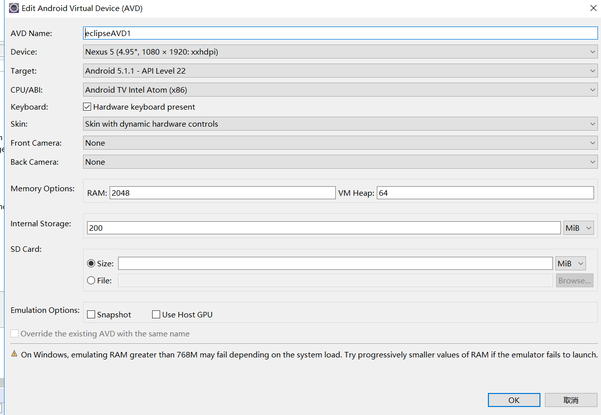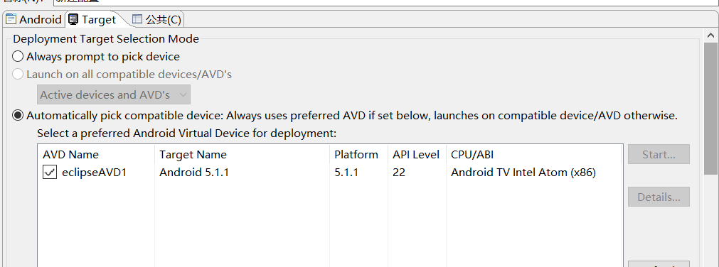 如果target里面没有自己的AVD(虚拟机)自己新建一个,点击 Manager->create 配置信息如图所示