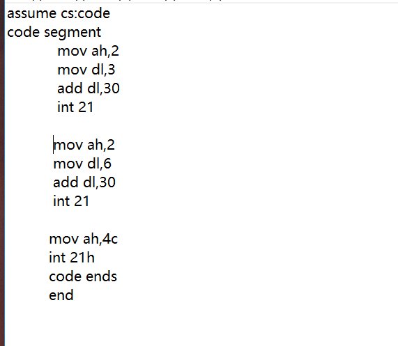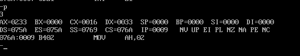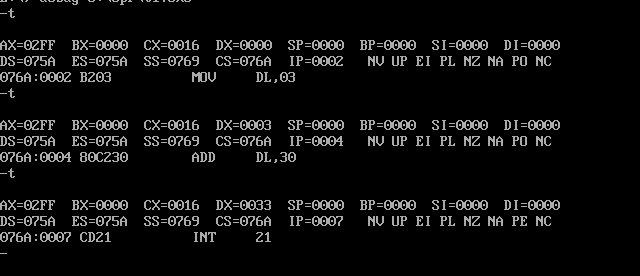 2·将line4和line9中寄存器dl的值分别修改为0到9中任何一个数字,重新汇编连接运行,观察其结果