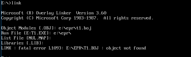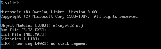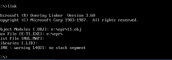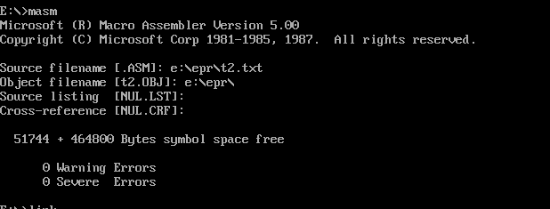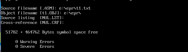 第二步:对源程序t1.txt进行汇编、连接、运行、调试