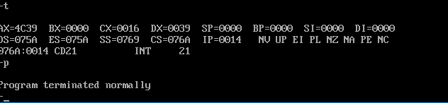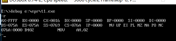 1:用debug对t1.exe进行测试:并使用r命令查看。观察寄存器cx的值是多少;