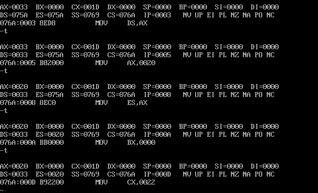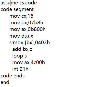 1:综合使用loop,[bx],编写完整汇编程序,实现向内存b800:07b8开始的连续16个字单元重复填充字数据0403h