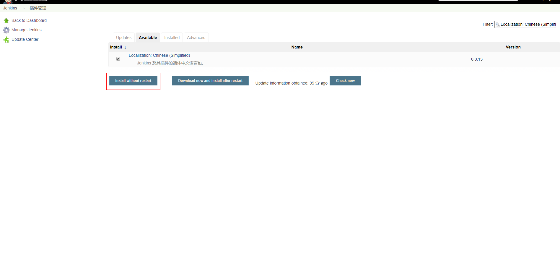 1.在插件管理,搜索 Localization: Chinese (Simplified),然后点击Install without restart