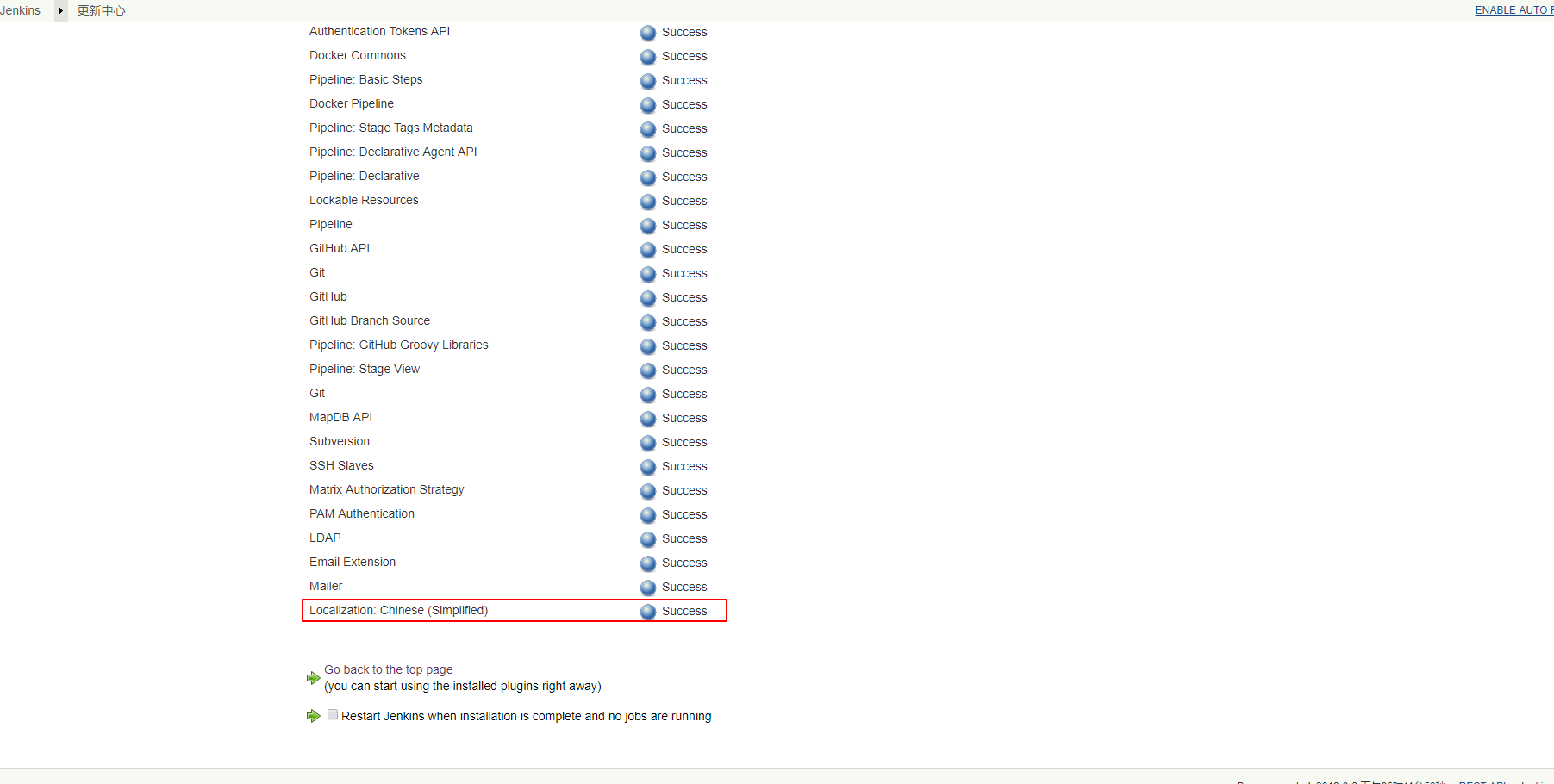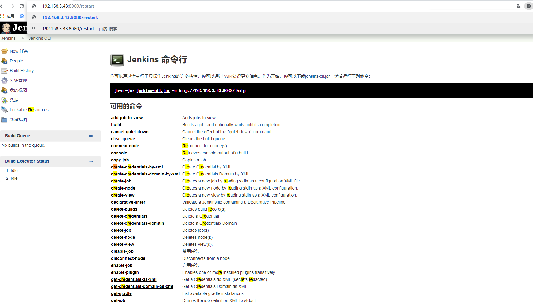3.在地址栏输入 restart 重启Jenkins,就可以看到已经显示中文了