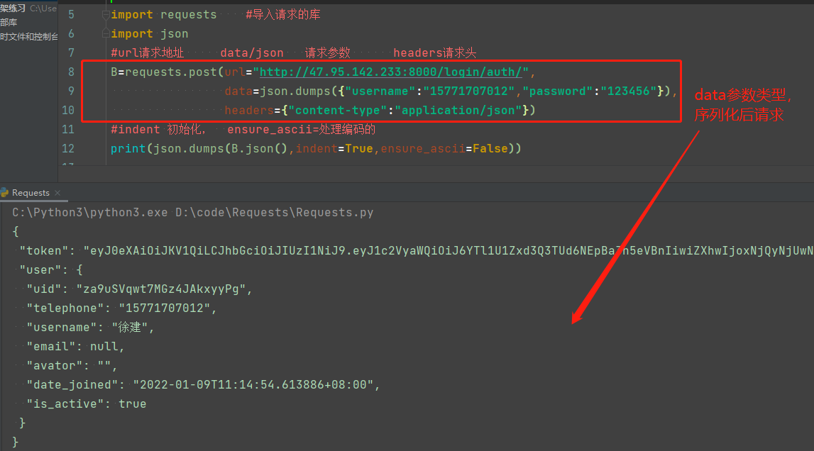 data和json的区别 什么时候使⽤json 当请求参数是JSO N的时候使⽤json的参数 当请求参数是json,但是要使⽤data的参数,那么请求参数要进⾏序列化的处理 什么时候使⽤data 当请求参数是表单的时候使⽤data 当请求参数是JSON格式的时候,那么请求参数要进⾏序列化的处理