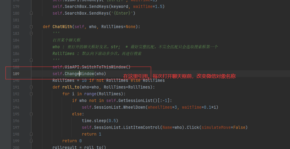 def ChatWith(self, who, RollTimes=None): ''' 打开某个聊天框 who : 要打开的聊天框好友名,str; * 最好完整匹配,不完全匹配只会选取搜索框第一个 RollTimes : 默认向下滚动多少次,再进行搜索 ''' self.UiaAPI.SwitchToThisWindow() self.ChangeWindow(who) # [2] 加入如下方法,在每次更改聊天对象时调用 ChangeWindow 方法 ... ...