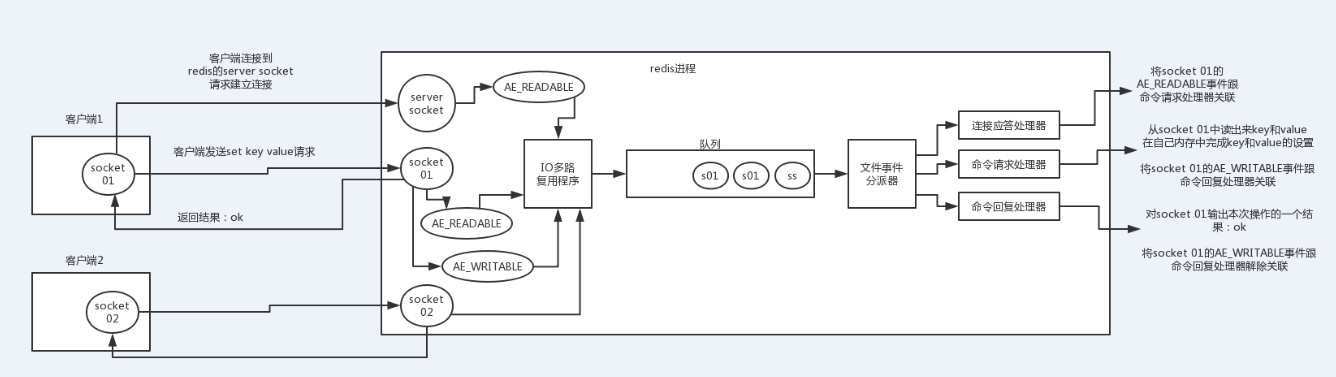如果是客户端要写数据到redis,那么会为socket关联命令请求处理器