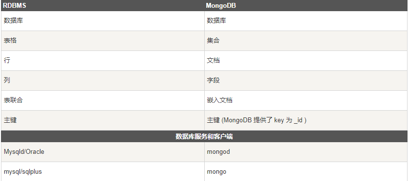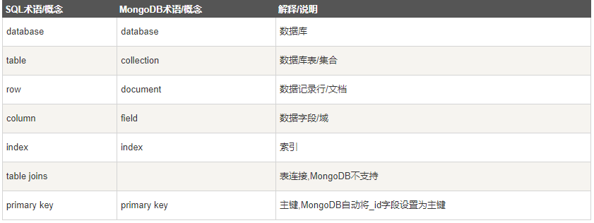 下表列出了 RDBMS 与 MongoDB 对应的术语: