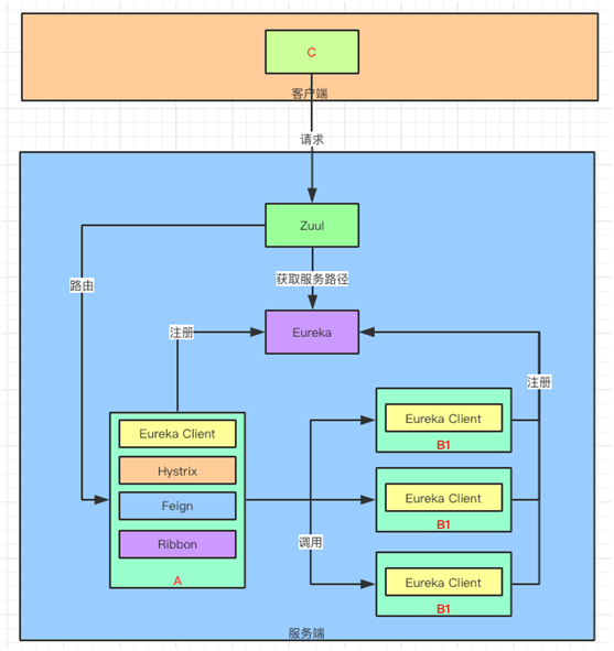 首先,“A”服务在 Eureka 进行注册,然后“C”客户端向 Zuul 发起请求,访问“A”服务。Zuul 向 Eureka 获取“A”服务的地址,之后访问“A”服务。