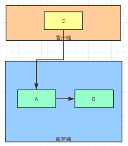 客户端“C”调用服务“A”,服务“A”调用服务“B”