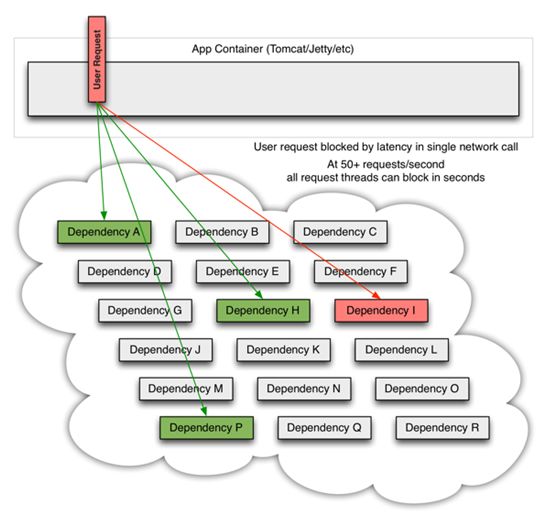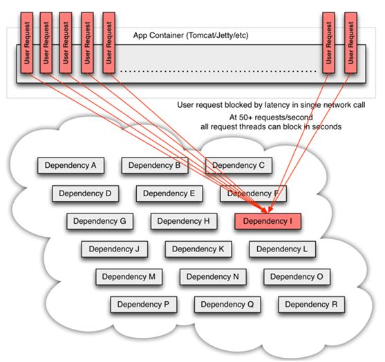 单个服务依赖多个服务,依赖服务中有一个出现问题,对整体产生影响。