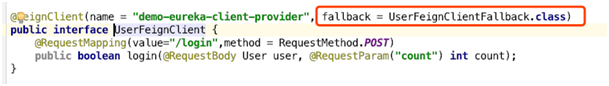 第二步,在“A”服务(消费者)调用“B”服务的方法的 Annotation 上面标注调用失败需要执行的“第一步”的这个方法。