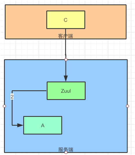 实际上这里缺少一个网关,把“C”客户端与“A”服务链接起来的网关。