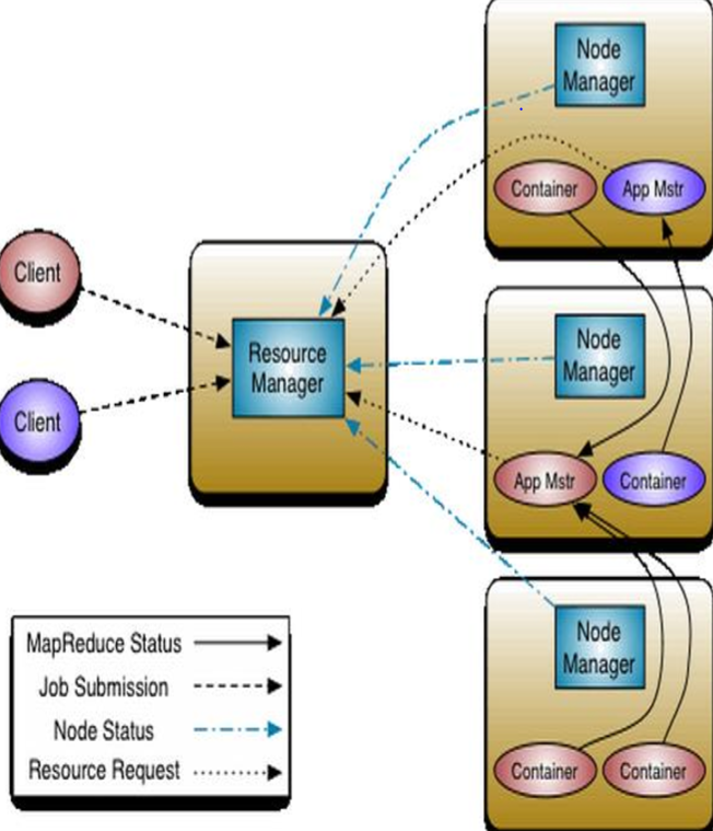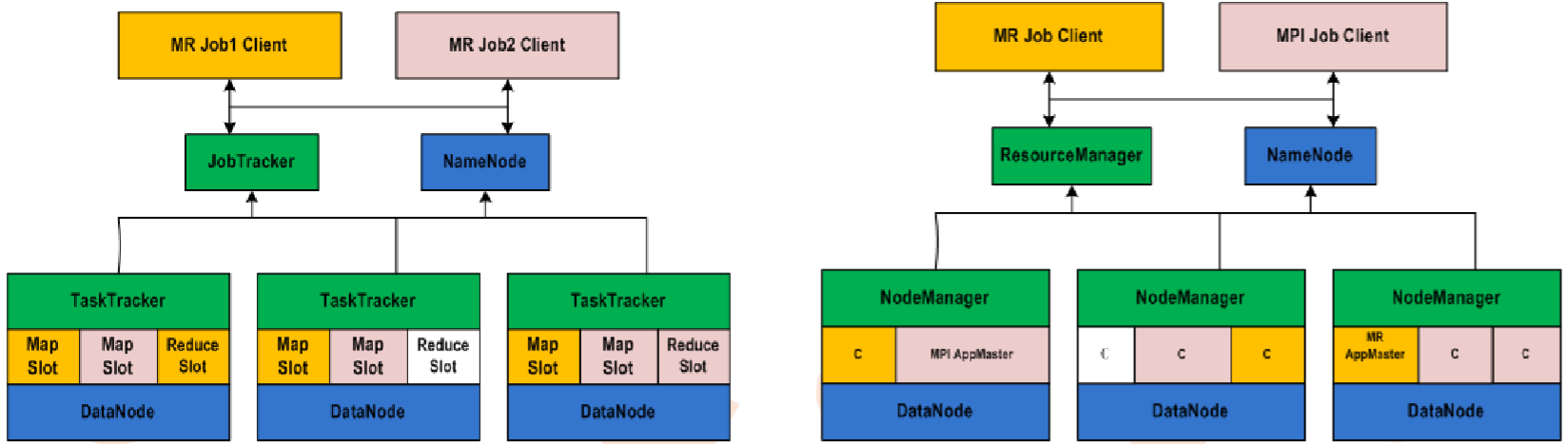 • 原框架中核心的 JobTracker 和 TaskTracker 不见了,取而代之的是 ResourceManager, ApplicationMaster 与 NodeManager 三个部分