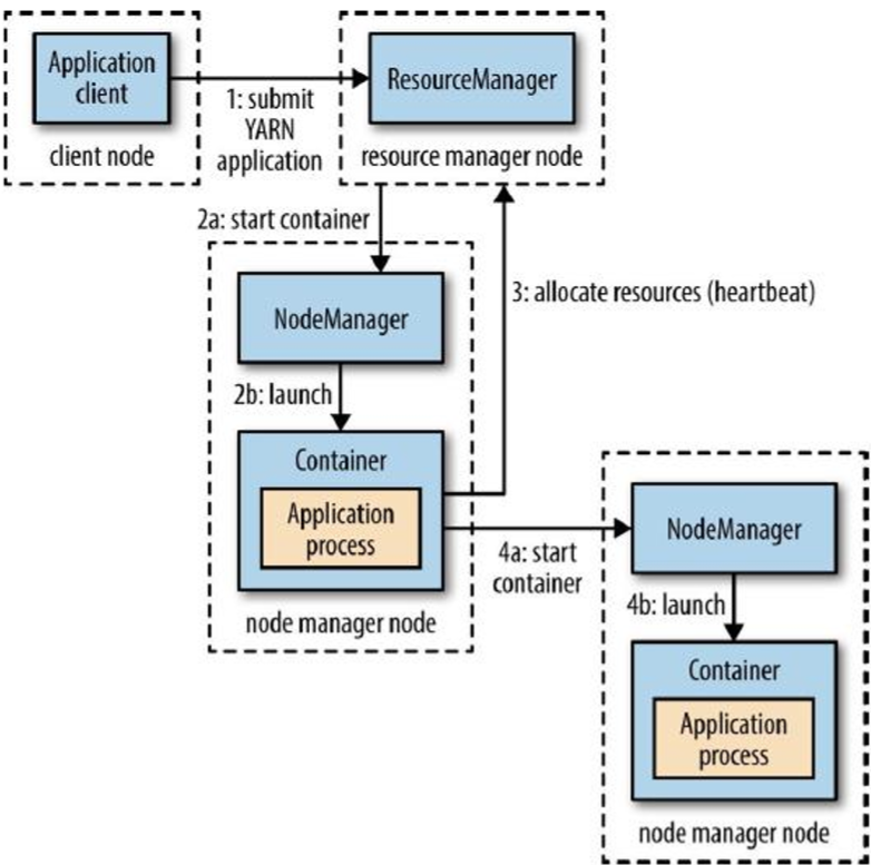 • Resource Manager选择一个Node Manager,启 动一个Container并运行Application Master实例( step 2a、step 2b);