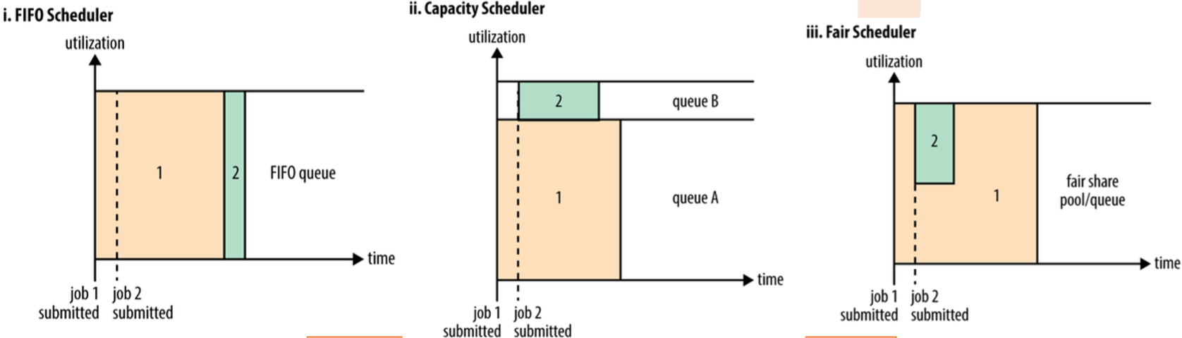 • FIFO Scheduler:按提交顺序,最简单,大应用占用所有集群资源,不适合共享集群