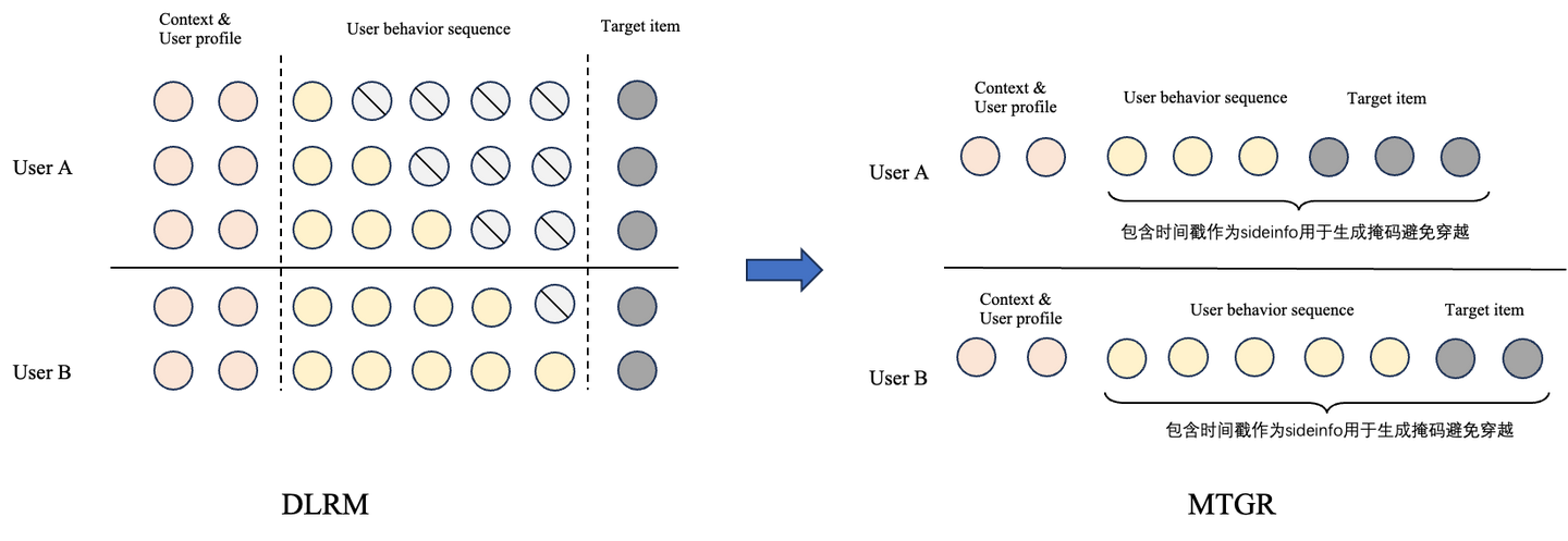 DLRM在处理不同长度的序列数据时,往往使用padding进行补全,MTGR采用稀疏化存储,配合JaggedTensor以及变长的HSTU算子,抛弃了全部padding操作以降低无效存储和冗余计算。额外的,为了避免训练穿越,对于用户行为序列以及target item,在数据中保存了其发生的原始时间戳,以用于生产掩码保证正确的因果性