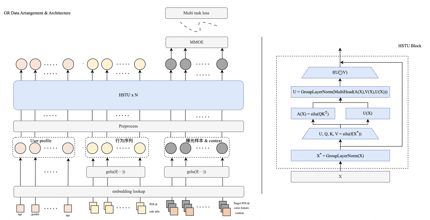 - 把特征token输入到HSTU,采用了Group LayerNorm(针对不同类别的Token采用不同的LayerNorm参数,以实现不同语义空间下Token的对齐)