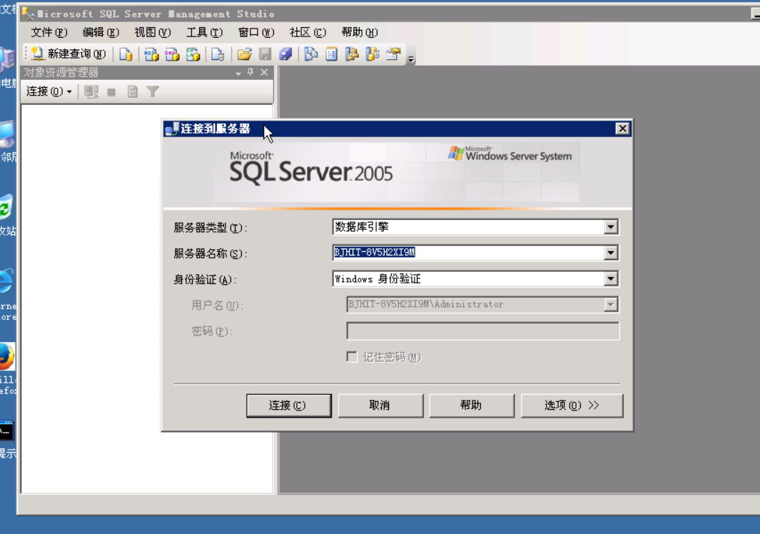 ①在桌面上单击“开始”,选择“程序”→“Microsoft SQL Server 2005” →“SQL Server Management Studio”,出现“连接到服务器”对话框。