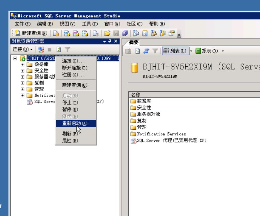 在“对象资源管理器”中,右击服务器,然后单击“重新启动”
