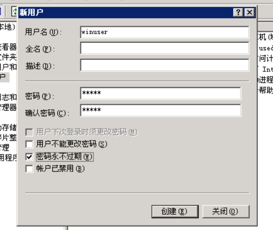 添加一个用户WinUser,并给该用户设置一个密码,本实验使用的密码是admin,密码可随意设置,但是需要记住,在后面需要用到,把用户下次登录时须更改密码前面的勾选去掉,把密码永不过期的选项选上,然后点击创建,设置如图: