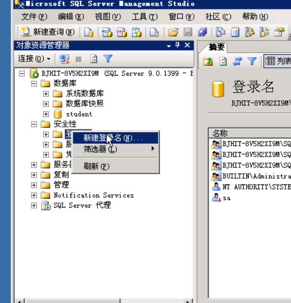 ①在 SQL Server Management Studio中,展开实例下的“安全性”,右击“登录名”按钮,在弹出的快捷菜单中选择“新建登录”(参考前面新建登录步骤),
