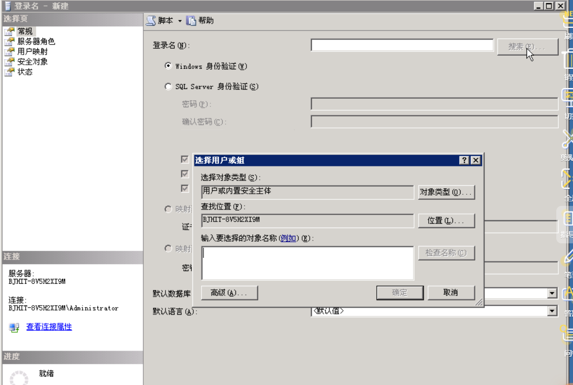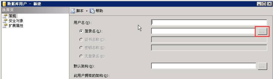 打开SQL Server登录属性对话框。在“常规”选项卡中,单击“名称”输入框右侧的按钮。