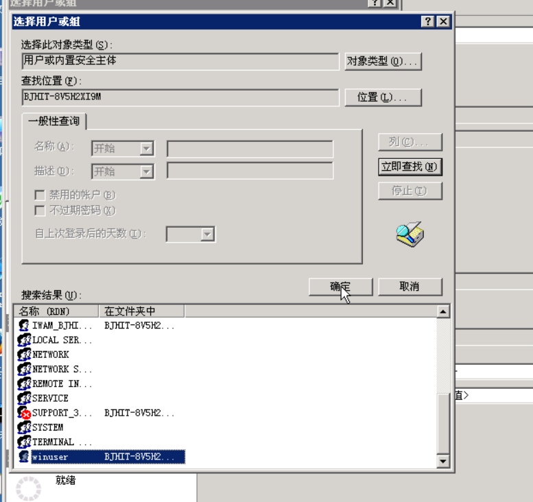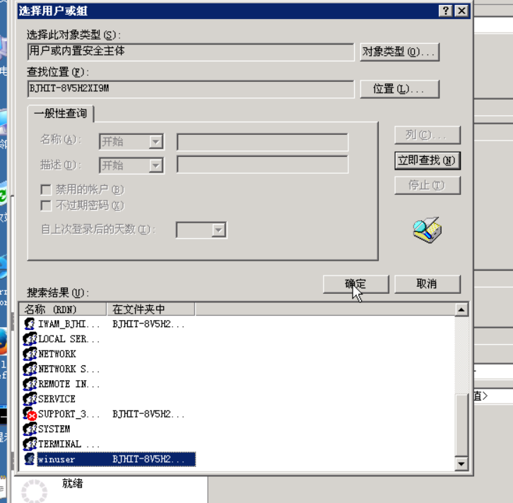 点击右侧的立即查找,在搜索结果中,找到winuser并选择该用户,然后点击确定。