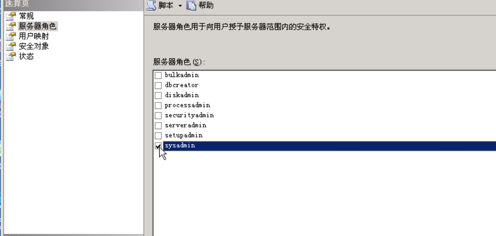 选择“服务器角色”选项卡。可以在服务器角色列表框中选择相应的服务器角色成员。在这里,设置登录用户winuser的服务器角色为系统管理员
