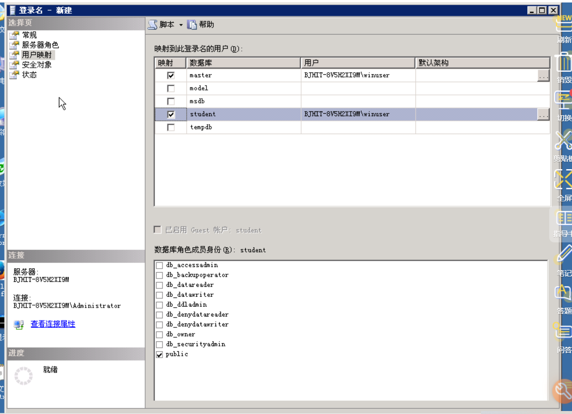 选择“用户映射”选项卡,在列表框中列出了该账号可以访问的数据库,如果单击数据库左边的复选框,表示该用户可以访问相应的数据库。在这里,选中数据库master和student左边的复选框,表示登陆用户winuser可以访问的数据库为master和student。在下方的数据库角色成员身份都选择public。然后点击确定