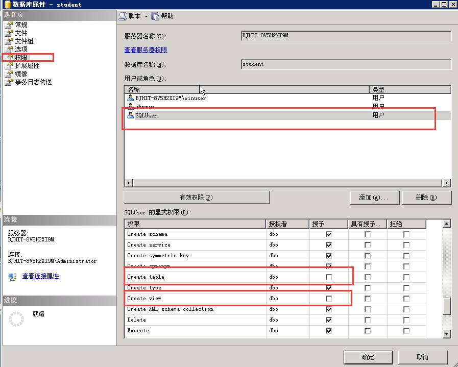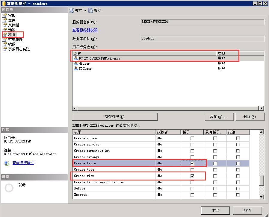 启动SQL Server Management Studio,展开实例数据库,右击student数据库,在弹出的快捷菜单中选择“属性”,然后选择“权限”选项卡。在用户WinUser一栏中,将“创建表”和“创建视图”选中.