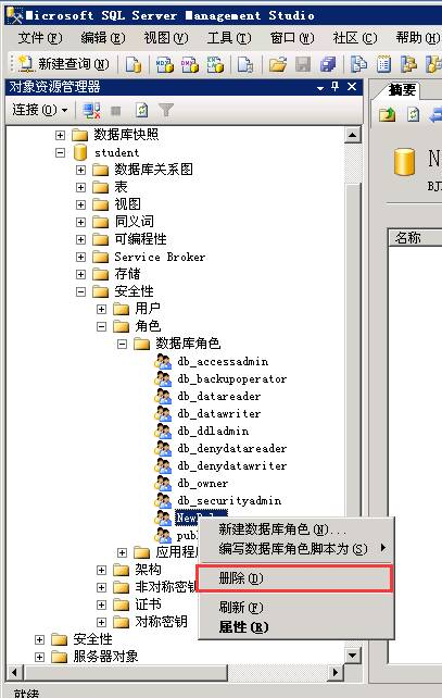 在SQL Server Management Studio中,用鼠标右键单击要删除的自定义角色,如NewRole,从弹出的菜单中选择“删除”命令即可删除自定义角色。