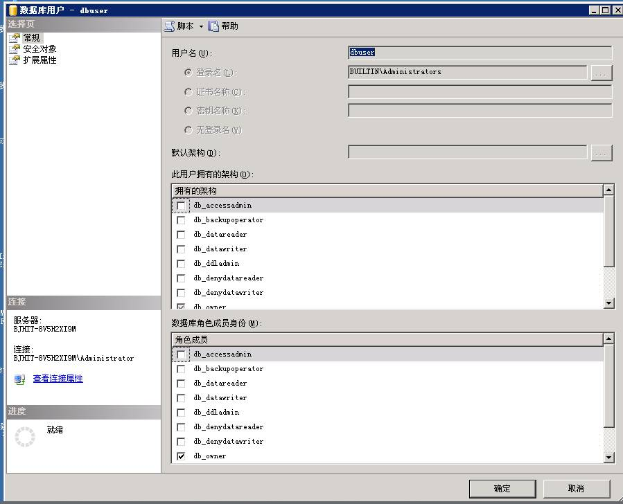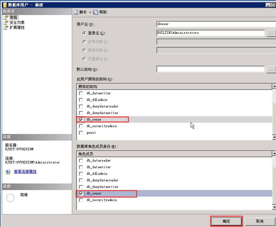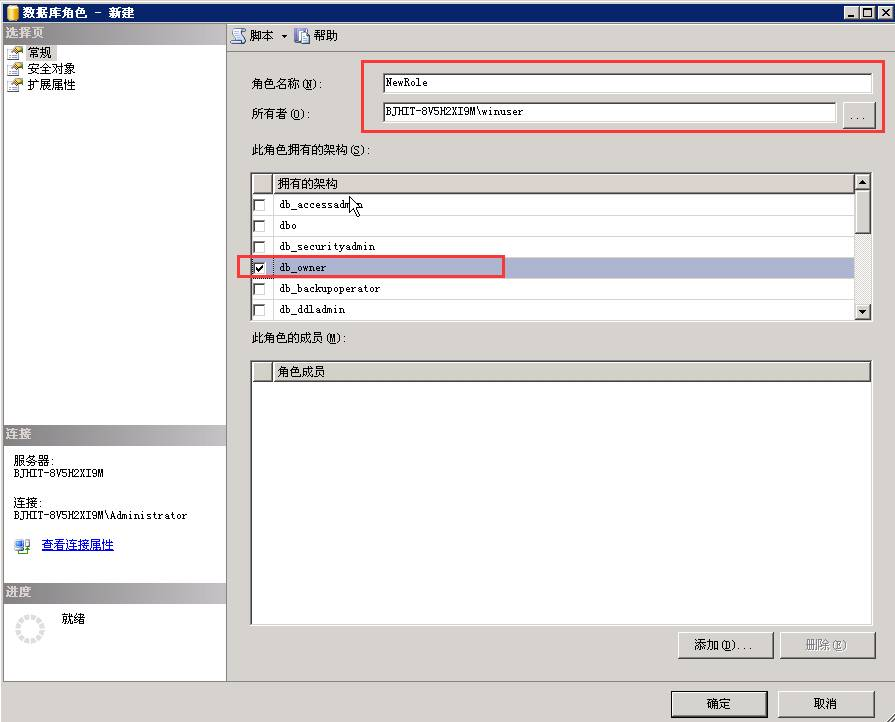 在此角色拥有的架构中选择db_owner,然后点击确定,完成角色创建。