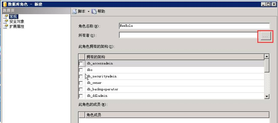 弹出“新建角色”对话框,在角色名称输入框中输入数据库新角色的名称,如NewRole,点击所有者后面的按钮