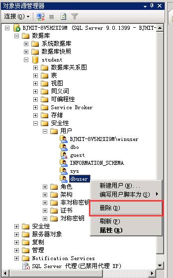 在企业管理器中,用鼠标右键单击要删除的数据库用户,如数据库student中的数据库用户dbuser,从快捷菜单中选择“删除”命令即可。