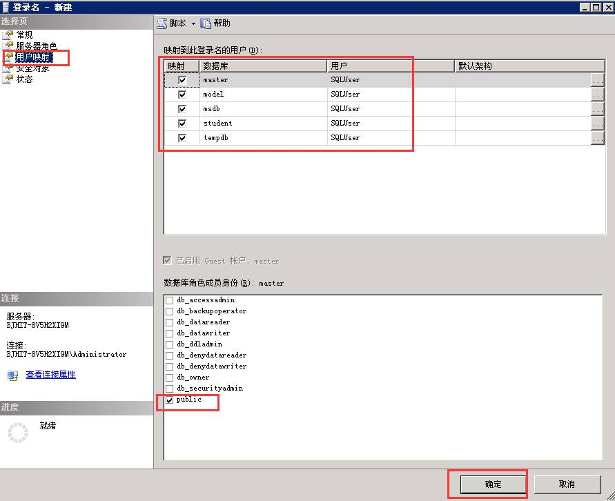 ③单击“用户映射”,在“映射到此用登录名的用户”中,将所有数据库都选中,下方的数据库角色成员身份全部选择public,然后单击确定完成账号的创建。