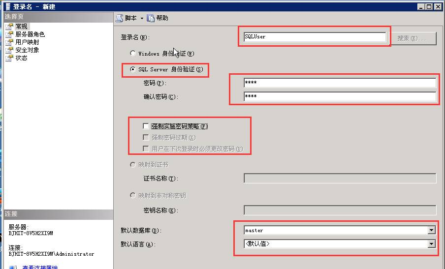 ②在登录名输入框内输入需要新建的用户名,这里新建的用户名是SQLUser。验证方式选择SQL Server身份验证,然后在密码框输入SQLUser的密码。这里设置成test。把强制实施密码策略的复选框去勾选去掉,默认数据库选择master,然后点击确认。