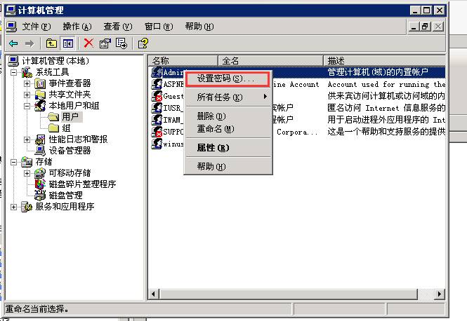 来到桌面,右击我的电脑,点击管理,在计算机管理窗口,依次展开 系统工具-本地用户和组-用户(不会的可参考之前新建winuser时的步骤),在右侧右击administrator,选择设置密码。