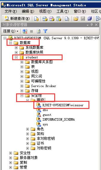 同时,展开数据库-系统数据库-student-安全性-用户,在用户列表中可以看到数据库student中已经建立一个数据库用户winuser。
