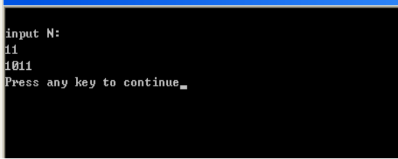 void conveshen(SqStack *S) { ElemType n,h; int m=0,k=0; InitStack(S); printf("Input element\n"); scanf("%d",&n); while(n) { m++; Push(S,n%2); n=n/2; } while(k<m) { k++; Pop(S,&h); printf("%d",h); } } int main() { SqStack S; conveshen(&S); printf("\n"); }