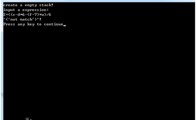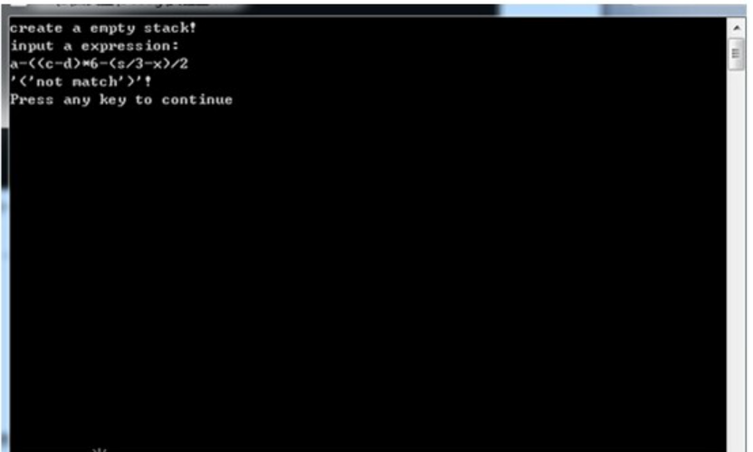 #include<stdio.h> #include<malloc.h> #include<string.h> #define M 20 #define elemtype char typedef struct { elemtype stack[M]; int top; } stacknode; void init(stacknode *st); void push(stacknode *st,elemtype x); void pop(stacknode *st); void init(stacknode *st) { st->top=0; } void push(stacknode *st,elemtype x) { if(st->top==M) printf("the stack is overflow!\n"); else { st->top=st->top+1; st->stack[st->top]=x; } } void pop(stacknode *st) { if(st->top>0) st->top--; else printf(“Stack is Empty!\n”); } int main() { char s[M]; int i; stacknode *sp; printf("create a empty stack!\n"); sp=malloc(sizeof(stacknode)); init(sp); printf("input a expression:\n"); gets(s); for(i=0;i<strlen(s);i++) { if(s[i]=='(') push(sp,s[i]); if(s[i]==')') pop(sp); } if(sp->top==0) printf("'('match')'!\n"); else printf("'('not match')'!\n"); return 0; }