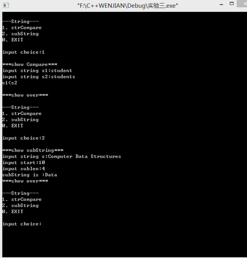 #include<stdio.h> #include<string.h> #define MAXSIZE 100 typedef struct{ char data[MAXSIZE]; int length; }SqString; int strCompare(SqString *s1,SqString *s2); /*串的比较*/ void show_strCompare(); void strSub(SqString *s,int start,int sublen,SqString *sub); /*求子串*/ void show_subString(); int strCompare(SqString *s1,SqString *s2){ int i; for(i=0;i<s1->length&&i<s2->length;i++) if(s1->data[i]!=s2->data[i]) return s1->data[i]-s2->data[i]; return s1->length-s2->length; } void show_strCompare(){ SqString s1,s2; int k; printf("\n***show Compare***\n"); printf("input string s1:"); gets(s1.data); s1.length=strlen(s1.data); printf("input string s2:"); gets(s2.data); s2.length=strlen(s2.data); if((k=strCompare(&s1,&s2))==0) printf("s1=s2\n"); else if(k<0) printf("s1<s2\n"); else printf("s1>s2\n"); printf("\n***show over***\n"); } void strSub(SqString *s,int start,int sublen,SqString *sub){ int i; if(start<1||start>s->length||sublen>s->length-start+1){ sub->length=0; } for(i=0;i<sublen;i++) sub->data[i]=s->data[start+i-1]; sub->length=sublen; } void show_subString(){ SqString s,sub; int start,sublen,i; printf("\n***show subString***\n"); printf("input string s:"); gets(s.data); s.length=strlen(s.data); printf("input start:"); scanf("%d",&start); printf("input sublen:"); scanf("%d",&sublen); strSub(&s,start,sublen,&sub); if(sub.length==0) printf("ERROR!\n"); else{ printf("subString is :"); for(i=0;i<sublen;i++) printf("%c",sub.data[i]); } printf("\n***show over***\n"); } int main(){ int n; do { printf("\n---String---\n"); printf("1. strCompare\n"); printf("2. subString\n"); printf("0. EXIT\n"); printf("\ninput choice:"); scanf("%d",&n); getchar(); switch(n){ case 1:show_strCompare();break; case 2:show_subString();break; default:n=0;break; } }while(n); return 0; }