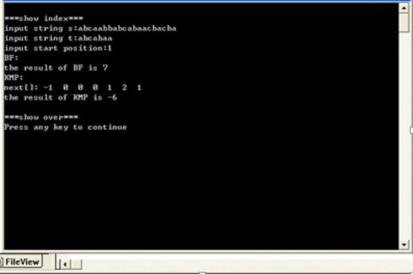 } void show_index(){ SqString s,t; int k,next[MAXSIZE]={0},i; printf("\n***show index***\n"); printf("input string s:"); gets(s.data); s.length=strlen(s.data); printf("input string t:"); gets(t.data); t.length=strlen(t.data); printf("input start position:"); scanf("%d",&k); printf("BF:\nthe result of BF is %d\n",index_bf(&s,&t,k)); getNext(&t,next); printf("KMP:\n"); printf("next[]:"); for(i=0;i<t.length;i++) printf("%3d",next[i]); printf("\n"); printf("the result of KMP is %d\n",index_kmp(&s,&t,k,next)); printf("\n***show over***\n"); } int main(){ show_index(); return 0; }