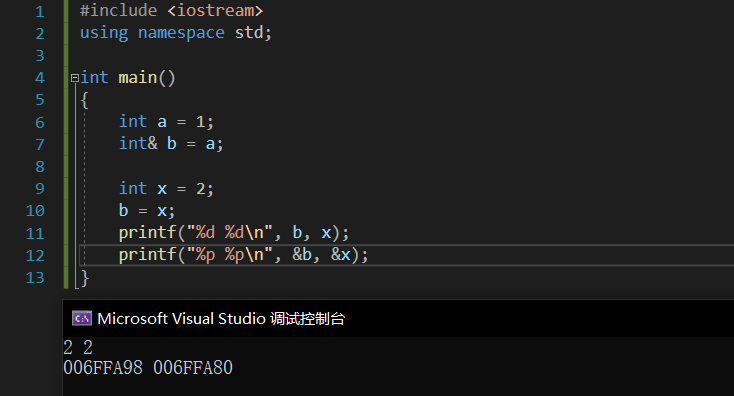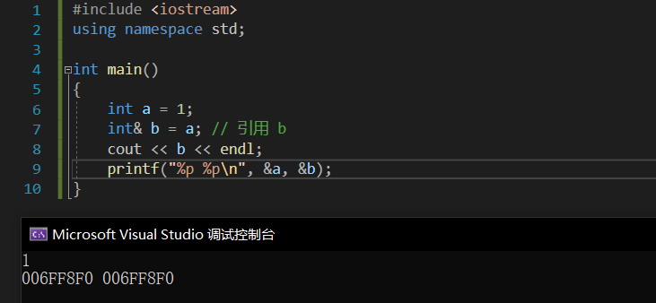 b 是变量a的一个别名, 打印b的值就是打印a的值,因为它们实际上指向的是同一块的内存空间